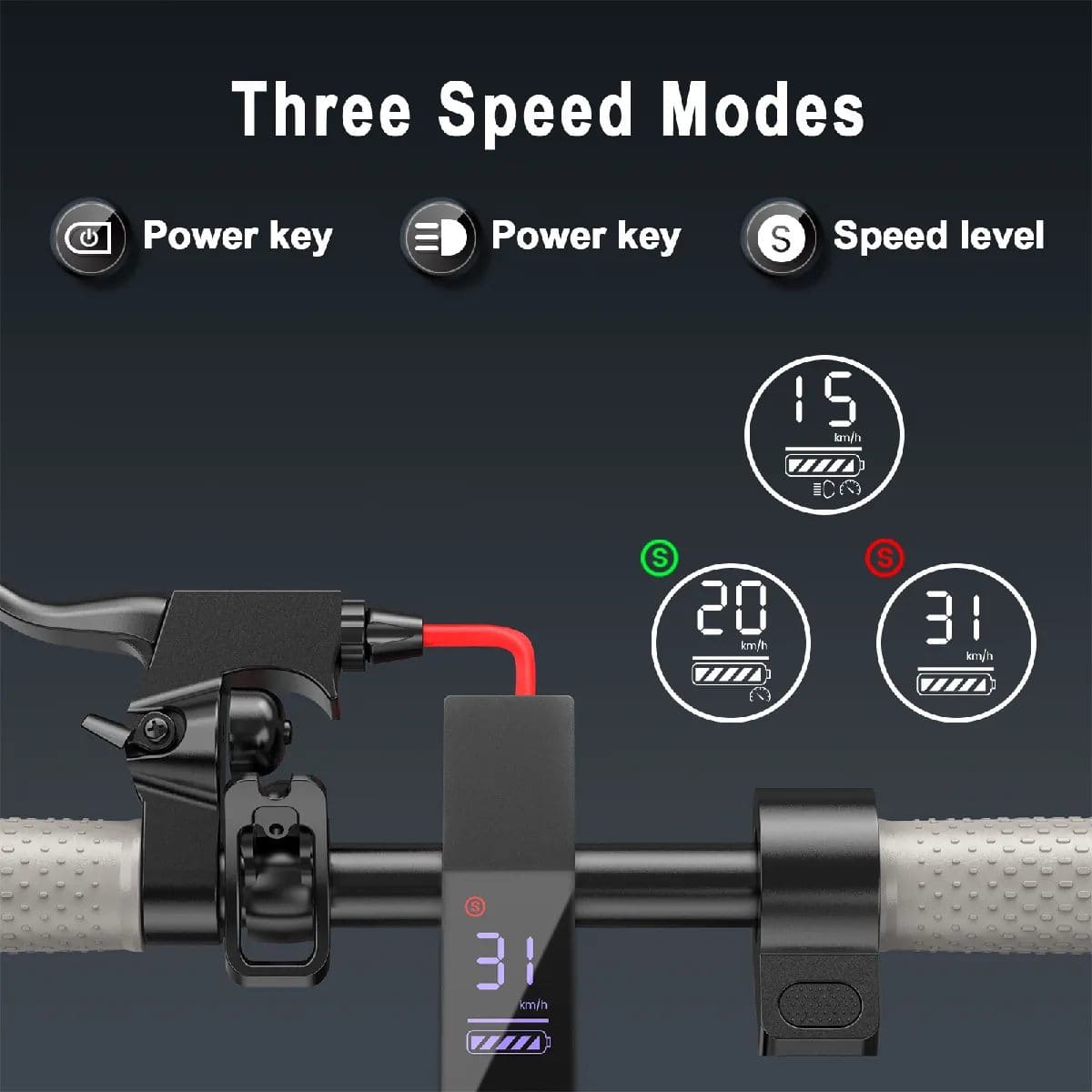 La trottinette propose trois vitesses préréglées : 15 km/h, 20 km/h et 25 km/h. Ces vitesses peuvent être ajustées à l’aide de l’écran ou via l’application mobile. L’utilisateur peut ainsi choisir un mode lent pour les zones piétonnes, un mode moyen pour un usage quotidien, ou un mode rapide pour les trajets dégagés. Cette flexibilité rend la conduite personnalisable selon les préférences.