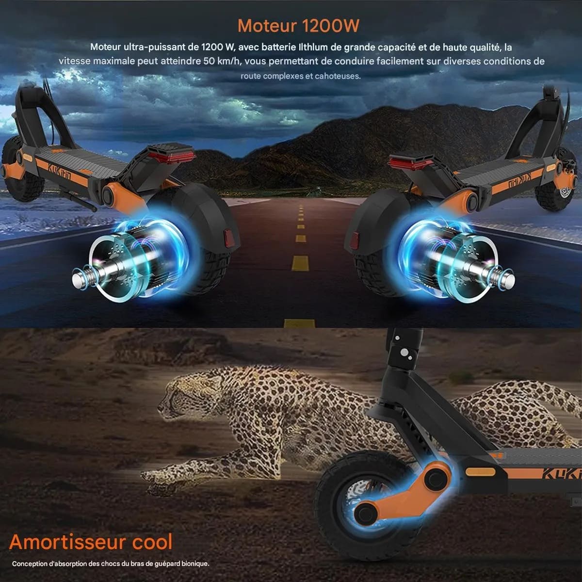Moteur puissant de 1 200 W offrant une vitesse maximale de 50 km/h et une conduite dynamique.