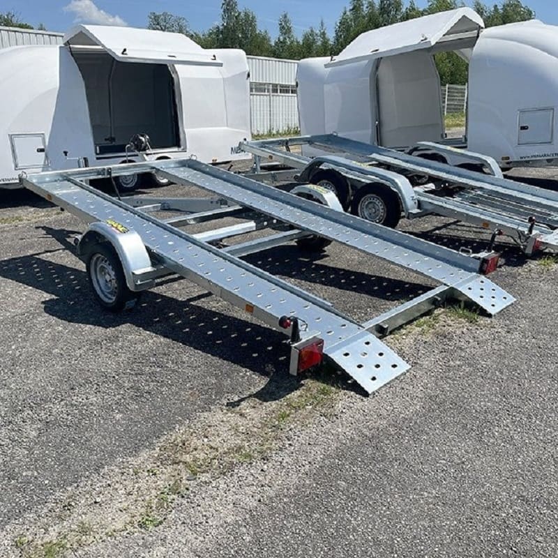 Cette remorque est idéale pour le transport de voitures, motos ou petits utilitaires. Son PTAC ajustable (de 1000 à 1600 kg) offre une grande polyvalence.