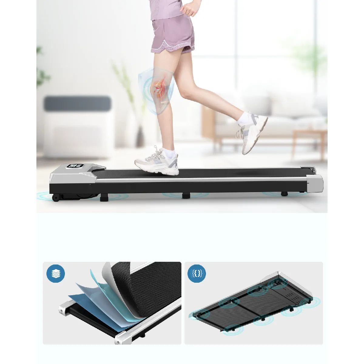 La bande de course repose sur une conception multicouche à absorption des chocs. Chaque couche a un rôle précis : confort du pied, dispersion de l’impact, stabilité et réduction des vibrations. Ce système protège efficacement les genoux, les hanches et les chevilles. Il convient parfaitement aux utilisateurs sensibles aux chocs ou souhaitant préserver leurs articulations.