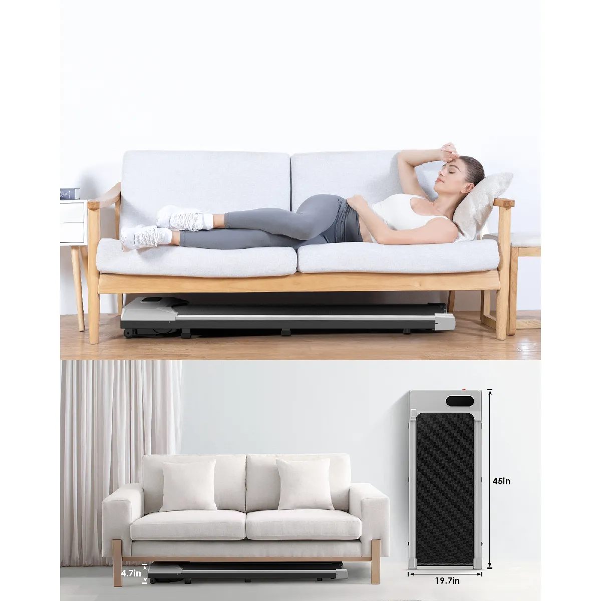 Le DSKEUZEEW Walking Pad se distingue par sa compacité exceptionnelle. Avec des dimensions de seulement 114,5 cm de long, 50 cm de large et 12 cm de hauteur, il se glisse sous la plupart des meubles bas. Que ce soit un lit, un canapé ou un bureau, il trouve toujours sa place. Vous gagnez en mobilité sans sacrifier d’espace.