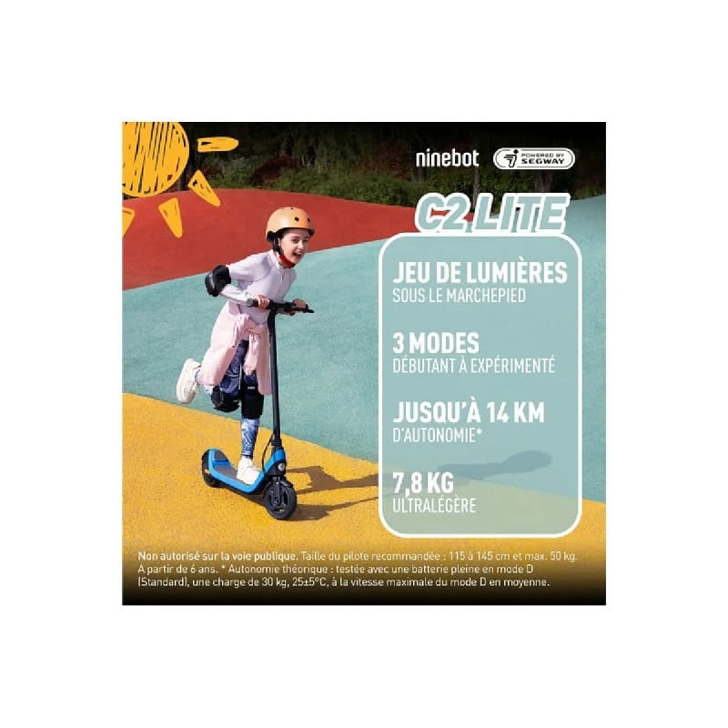 La trottinette électrique YAGO SEGWAY C2LITE est spécialement conçue pour les enfants de 6 à 12 ans, avec une capacité de charge maximale de 30 kg. Elle répond parfaitement aux besoins de cette tranche d’âge, en proposant une vitesse modérée, une autonomie suffisante et une conduite intuitive. Elle s’adresse autant aux débutants qu’aux enfants plus expérimentés qui recherchent une trottinette fiable et agréable à piloter.