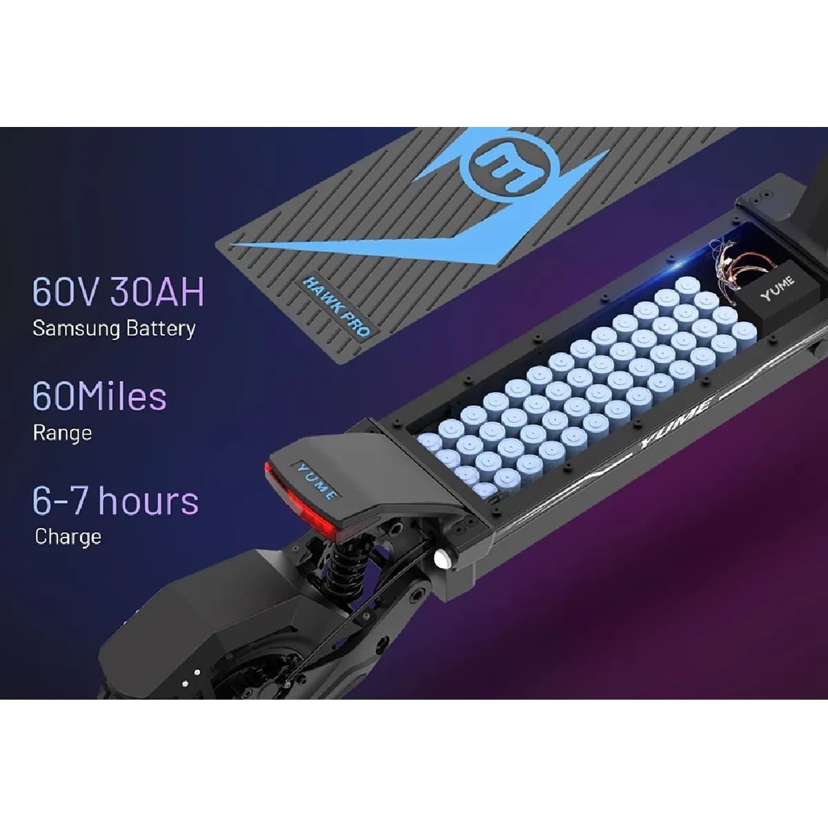 Le YUME Hawk Pro intègre une batterie lithium 60V 30Ah de haute capacité, conçue pour offrir une grande liberté de mouvement. Une seule charge permet de parcourir jusqu’à 60 miles (≈ 96 km) dans des conditions optimales. Cette autonomie étendue vous accompagne aussi bien pour les trajets urbains que pour les escapades en pleine nature.